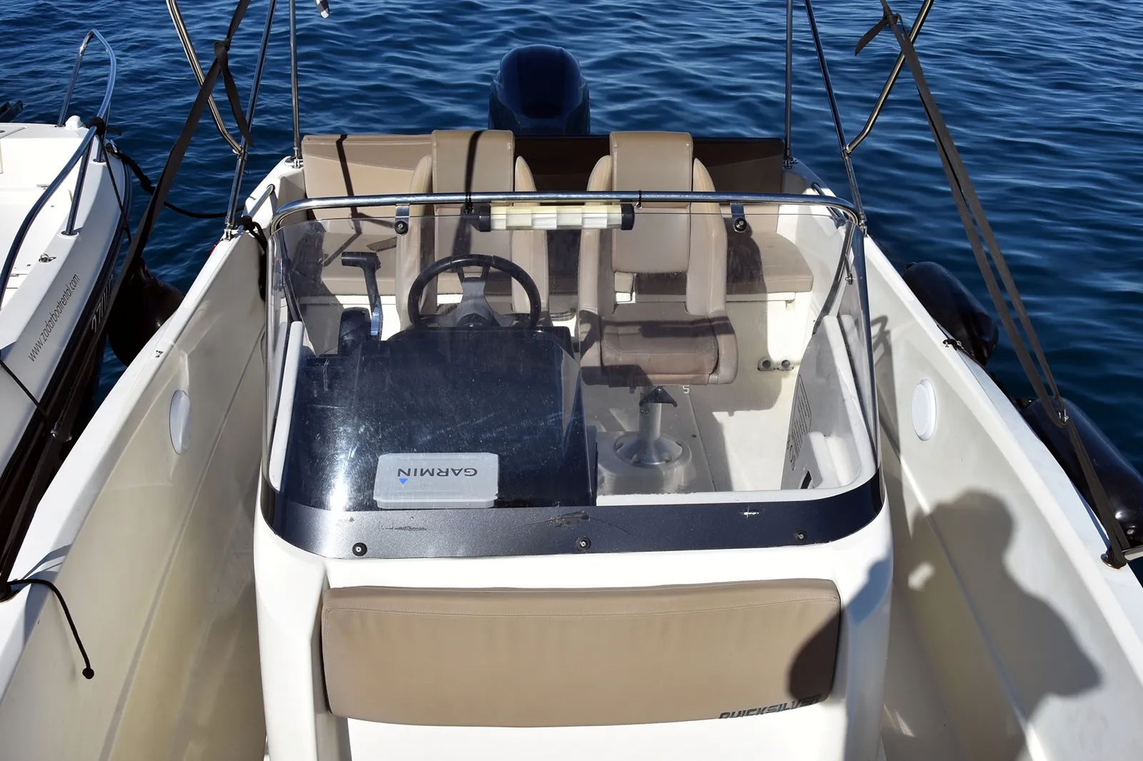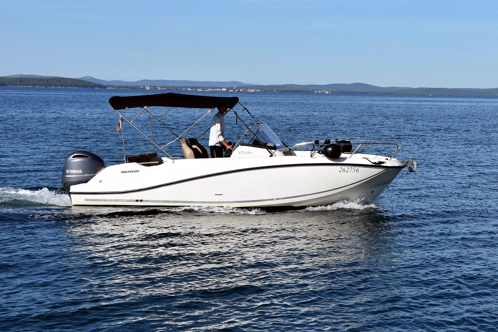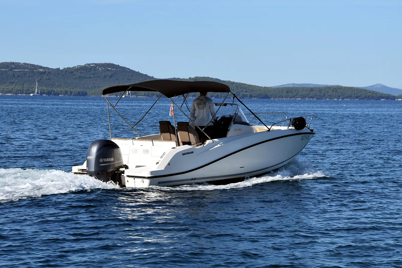 The Quicksilver 675 Open is the ideal day boat for a group of friends or a large family. It’s registered for up to 8 people and features a smartly designed cockpit area at the back, along with a spacious foldable sundeck at the front. A large bimini top offers plenty of shade, ensuring comfort for everyone on board.