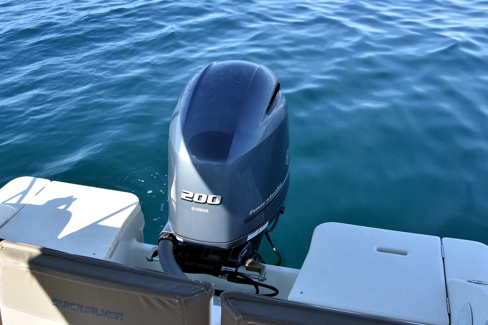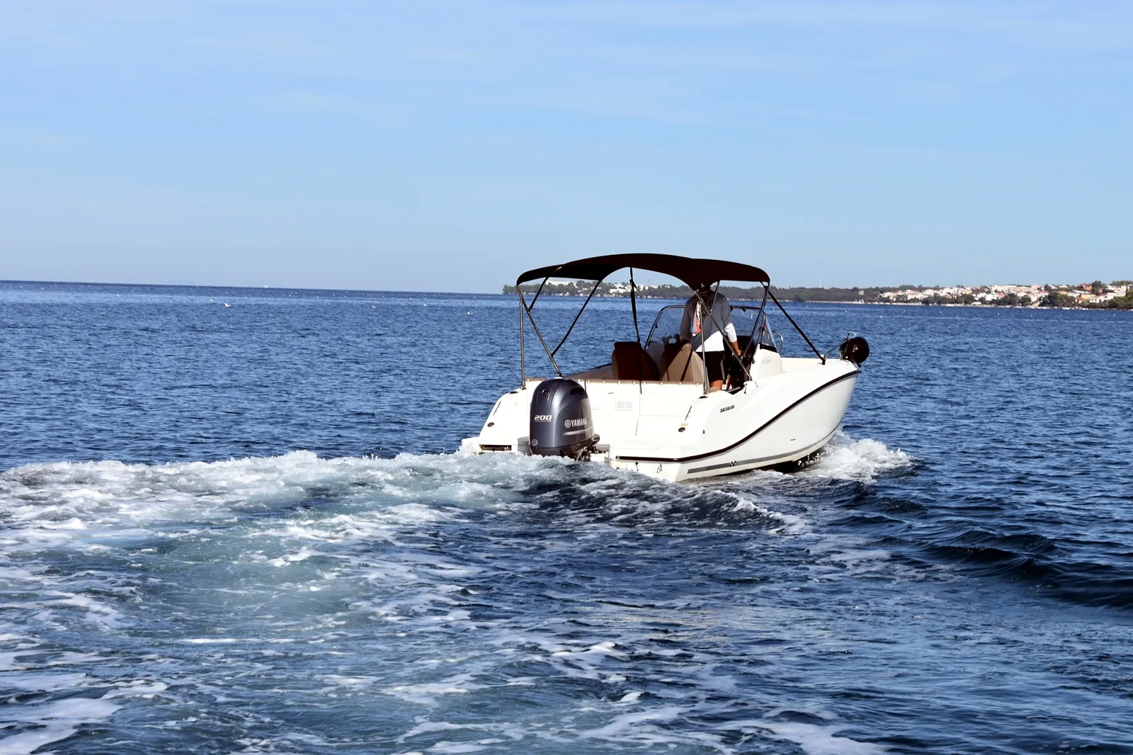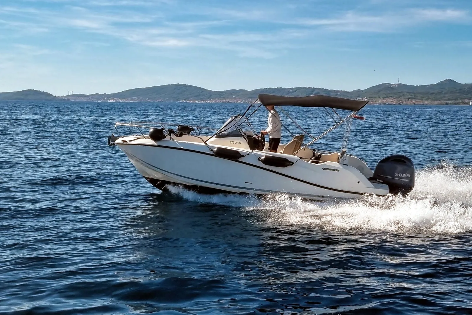 The Quicksilver 675 Open is the ideal day boat for a group of friends or a large family. It’s registered for up to 8 people and features a smartly designed cockpit area at the back, along with a spacious foldable sundeck at the front. A large bimini top offers plenty of shade, ensuring comfort for everyone on board.